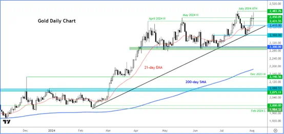 黄金K线图上的上涨趋势很明显。在我们看到更高的高点和更高的低点这一上升趋势被打破之前,我们将对多头给予肯定,并维持看涨黄金的技术预测。支撑位于2431美元、2410美元和2400美元。阻力位于2450美元,其次是7月份创下的历史高点2483美元。