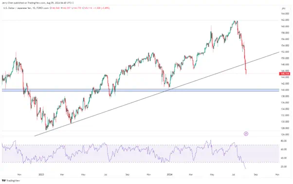 美元指数周五重大跌至103附近的5个月新低,这背后除了有美国降息预期推动之外,也受到日本央行“加息+缩表”导致美/日套利交易平仓的影响。美/日连续五周下行收于146.54,美股重挫正好加速了日元的回流。