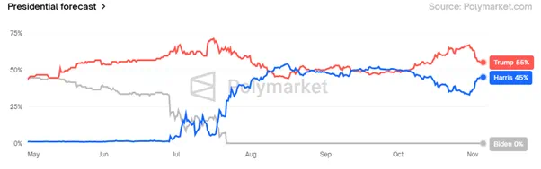 在去中心化的预测市场平台Polymarket上,截至113日特朗普以55%获胜概率领先于哈里斯,但领先幅度从上周开始出现缩水。